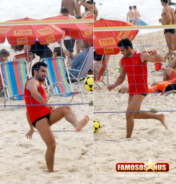 De camisa vermelha e sunga preta, o rapaz mostrou suas habilidades com a bola e deixou todos babando nas areias do Leblon.