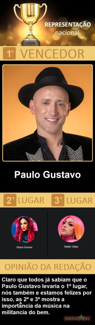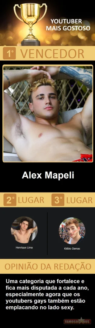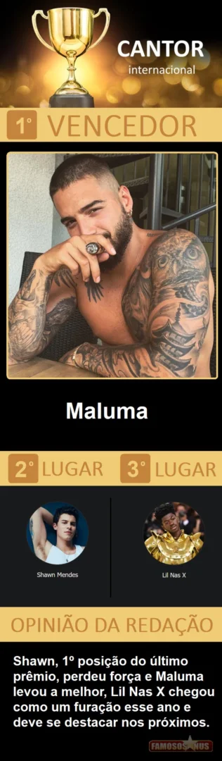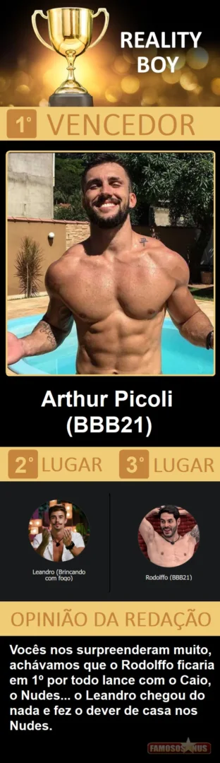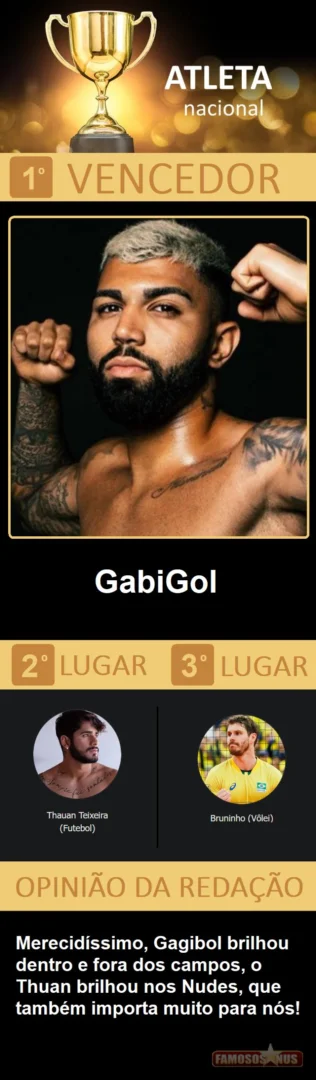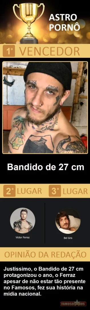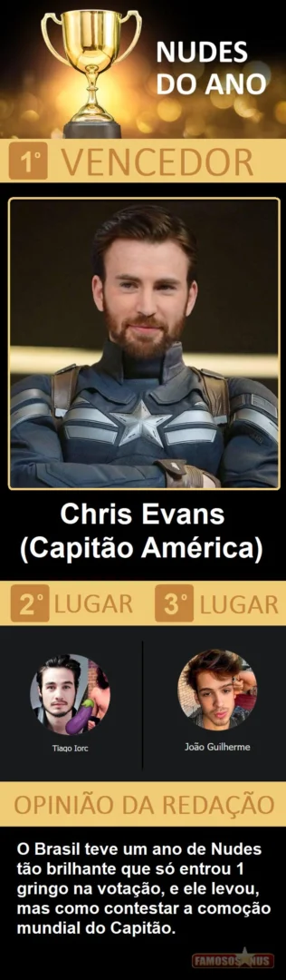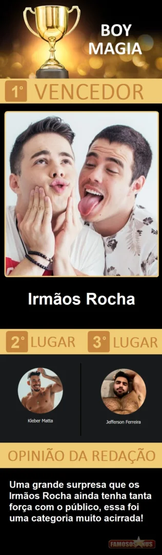 Depois de quase 10 dias de trabalho, quase 100 horas de empenho entre a seleção dos 184 concorrentes, elaboração de toda logistica, criação das votações, apuração e confecção do resultado, estamos muito felizes de apresentar a vocês a edição 2021 de nossa publicação mais importante do ano, o "Famosos Nus AWARDS", não desmecerendo as "100 matérias mais vistas do ano", que também é foda, que premia tudo que fez do Famosos Nus o maior portal gay do Brasil e um dos maiores e mais acessados do mundo.