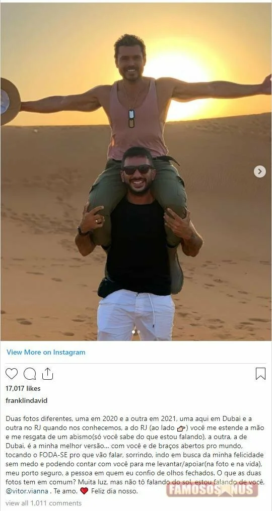 “Tocando o FODA-SE pro que vão falar, sorrindo, indo em busca da minha felicidade sem medo e podendo contar com você para me levantar/apoiar (na foto e na vida), meu porto seguro, a pessoa em quem eu confio de olhos fechados. O que as duas fotos tem em comum? Muita luz, mas não tô falando do sol, estou falando de você. Te amo. Feliz dia nosso”, finalizou o bonitão, caprichando na declaração de amor.