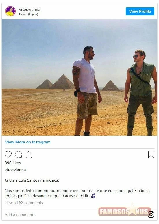 O ex-repórter do TV Fama apareceu sendo carregado por Vitor Vianna numa foto romântica e em outra bem paradisíaca com o por-do-sol como plano de fundo, para ilustrar esse comunicado para lá de romântico. Ele já conhecia o turismólogo pelo menos desde 2020, já que planejava com ele o canal de vídeo Aventureiros, falando justamente sobre viagens.