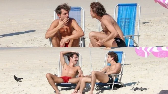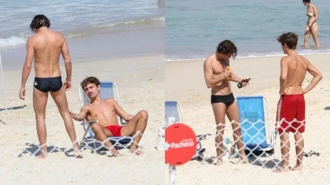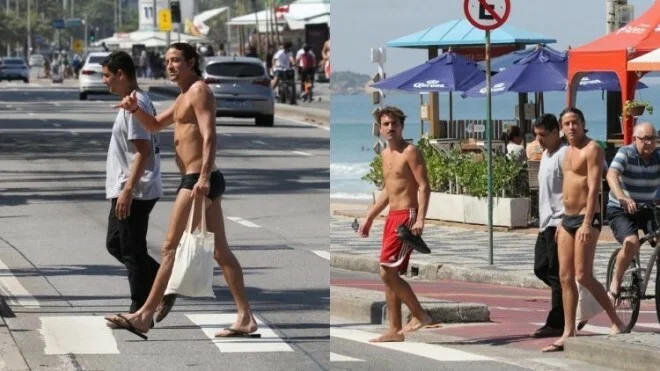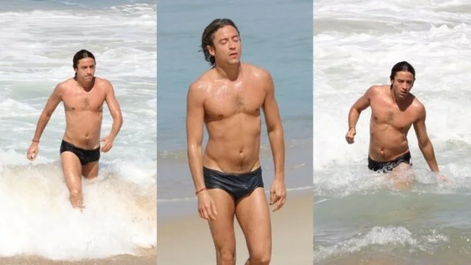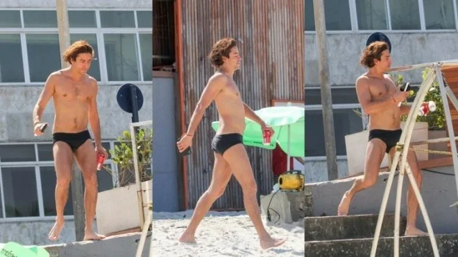 O galã, inclusive, sorriu para o paparazzo ao perceber que estava sendo filmado e mostrou a boa forma ao aparecer apenas usando uma sunguinha preta.