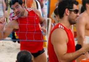 O ator Thierry Figueira fez um grande sucesso jogando futevôlei de camisa vermelha neste domingo, 2, na praia ...